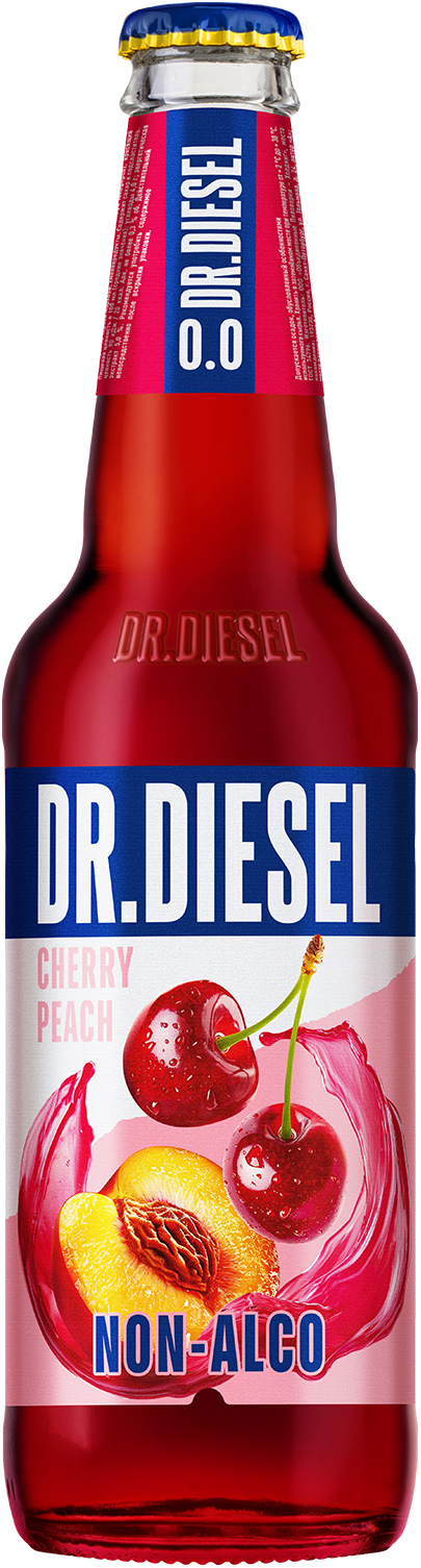 DR.DIESEL Cherry-Peach — безалкогольная версия освежающего напитка. Это яркий и необычный микс сладости и легкой кислинки: ароматная спелая вишня переплетается с бархатистым вкусом сладкого персика, создавая неповторимый вкус напитка.