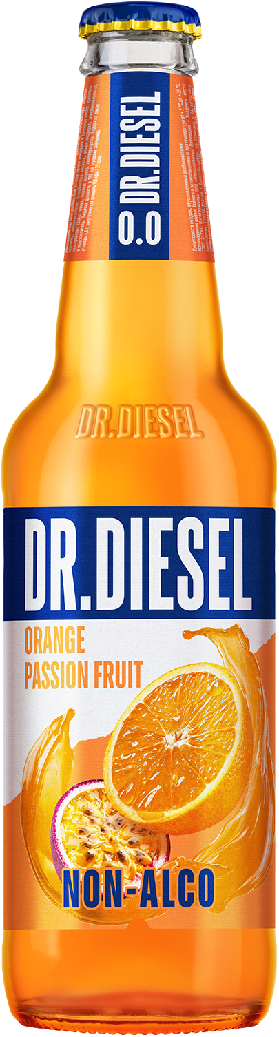 DR.DIESEL Orange-Passion Fruit 0.0 — безалкогольная версия освежающего напитка. Это яркий цитрусовый заряд с тропическими нотами: сочный апельсин в сочетании с экзотической кислинкой маракуйи подарят неповторимое вкусовое сочетание.
